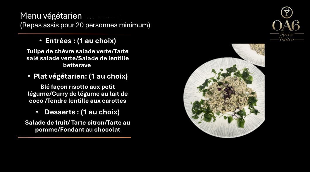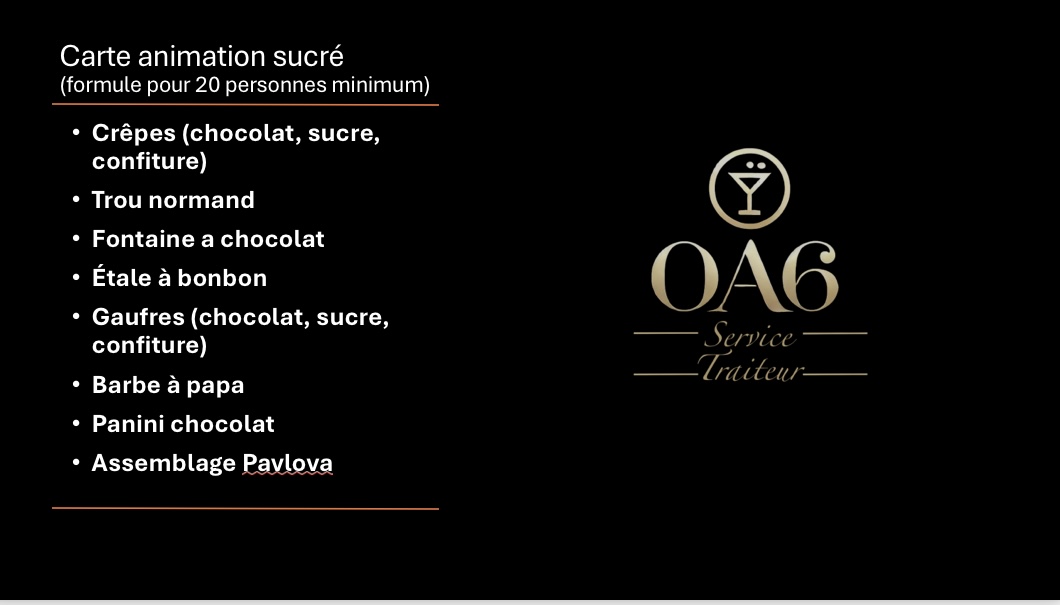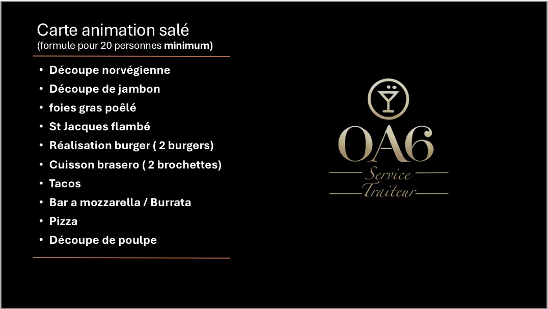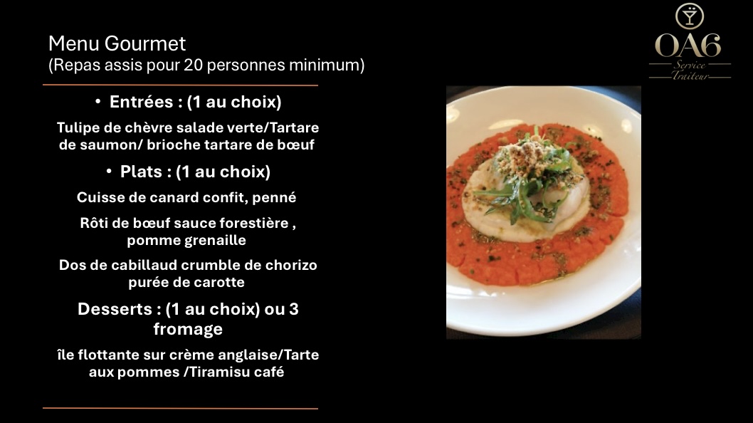 Avec L’OA6 Traiteur et le Chef Privé, vos repas deviennent des moments d’exception, où la gastronomie et le service se conjuguent pour offrir à vos invités une expérience inoubliable et raffinée.